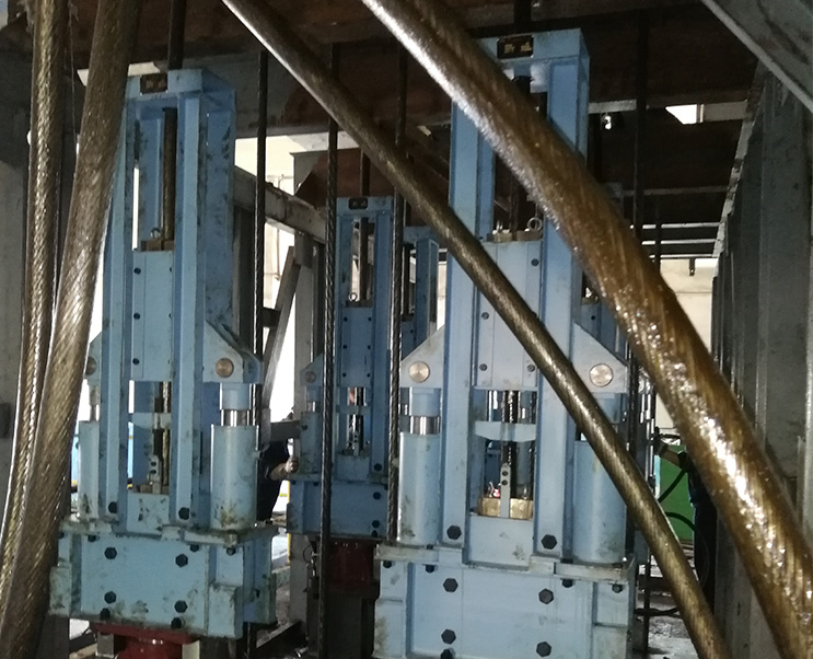 4、液壓調(diào)節(jié)罐道鋼絲繩的張緊力,動作靈敏,調(diào)節(jié)準(zhǔn)確;
